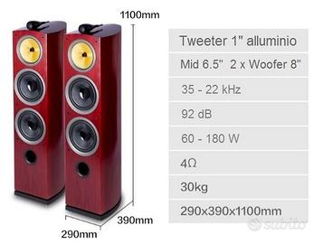 Composizione: Tweeter in seta trattata da 1”, mid-woofer in Kevlar da 6.5”, 2 x woofer in Kevlar da 2”, Bass Reflex sulla parte frontale