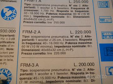 Coppia di diffusori acustici Micro Acoustic FRM-2A, produzione anni 1980, ditta americana specializzata nella costruzione di diffusori acustici e testine magnetiche (Micro-Acoustic Corporation 8, Westchester Plaza Elmsford, New York 10523), matr. n° 12933 e 12937, manca pannello anteriore.