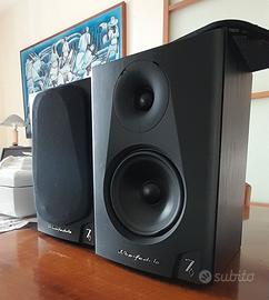 Le Wharfedale Diamond 7.2 sono diffusori da scaffale-libreria a 2 vie con sistema bass reflex, potenza nominale di 100W con sensibilità di 89 dB/W/m; woofer da13.3 cm e tweeter a cupola da 8 cm. Le dimensioni sono 29 x 19 x 23 cm e il peso è di circa 3 kg cadauna. Sono progettate per un utilizzo quale monitor da studio o per utilizzo in ambienti di dimensioni medio-piccole, max 25 mq. Consiglio, per un ascolto ottimale, posizionamento delle casse su piedestalli in modo da avere il tweeter ad altezza leggermente superiore all’orecchio dell’ascoltatore da seduto; distanza minima della cassa di almeno un metro dalla parete di fondo e da quella laterale. Amplificatore capace di fornire alle casse 20/25W RMS di potenza a bassa distorsione come pilotaggio per un ascolto ideale.