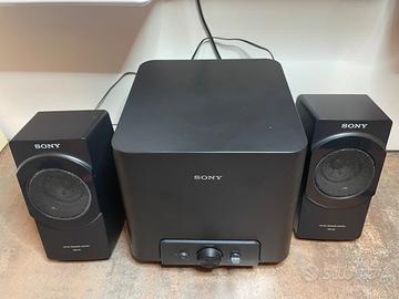 Diffusori Sony in ottime condizioni. Potenza 27W. Connessione con jack audio Dotati di subwoofer con bassi regolabili manualmente e due amplificatori.