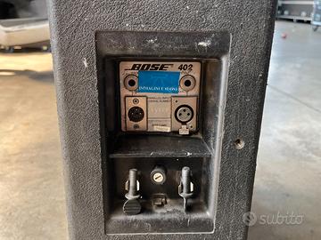 Vendiamo coppia di diffusori professionali Bose 402 in buone condizioni estetiche e di funzionamento con custodia Ingressi (paralleli)XLR maschio x 2 ¼ Jack x 2 Impedenza nominale8 ohm Trasduttoridriver full range 4 x 4½” (11,4 cm) Potenza nominale IEC120 W continui – 160 W di picco Risposta in frequenzada 90 Hz a 16 kHz ± 3 dB Sensibilità98 dB SPL (1 W, 1 m, 300 Hz – 3kHz) Dispersione120 gradi Orizzontale 60 gradi Mobile verticalepolipropilene stampato nero ad alto impatto DimensioniA59 cm x L21 cm x P18 cm Peso15 libbre/7 kg per altoparlante Volendo disponibili 4 coppie funzionanti + 1 singolo per info scrivere o chiamare. formula visto e piaciuto, no garanzia si può provare e ritirare a mano a Casalecchio di Reno per info 0510950527, rispondiamo a questi orari 9-13 e 15-18