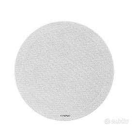 Diffusore acustico rotondo da incasso, a basso impatto visivo, tipo FRAMELESS (solo 5 mm di sporgenza), realizzato in materiale plastico tipo ABS con retina di protezione in lamiera di alluminio microforata.