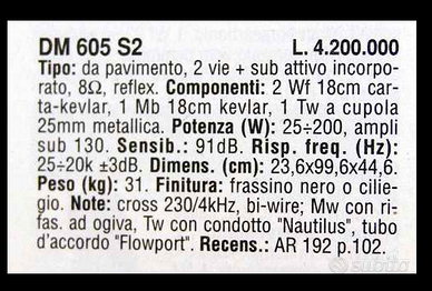 Rarità. introvabili ideali sia per home video che per musica! Il Bowers & Wilkins DM 605 S2 è un diffusore da pavimento a 3 vie dalle prestazioni elevate ed incredibili, noto soprattutto per il suo sistema di bassi attivi integrati. Questa caratteristica lo rende unico nella serie 600 dell'epoca (circa l'anno 2000), poiché include un amplificatore interno dedicato esclusivamente alla gestione dei woofer. Sistema a 3 vie: Combina un tweeter Nautilus a cupola metallica da 25 mm, un midrange in Kevlar da 180 mm e due woofer in carta/Kevlar da 180 mm. Sezione Bassi Attiva: Include un amplificatore integrato da 130W dedicato ai woofer, che permette di ottenere bassi profondi e potenti anche con amplificatori esterni di media potenza. Risposta in Frequenza: Estesa da 25Hz a 20kHz (± 3dB), garantendo una solida base per musica e home theater senza la necessità di un subwoofer esterno separato. Sensibilità e Impedenza: 91dB SPL con un'impedenza nominale di 8Ω (minimo 3Ω). Dimensioni: Altezza 996 mm, Larghezza 236 mm, Profondità 446 mm. Grazie ai bassi amplificati internamente, questi diffusori sono ideali sia per l'ascolto stereo hi-fi che per configurazioni home theater, dove offrono un impatto dinamico notevole. Fornisco anche le istruzioni d'uso, il manuale di servizio per eventuali manutenzioni e il seti di punte con le basi salvapavimento.. Altoparlanti e funzionamento generale controllato a febbraio 2026 da noto laboratorio di Milano che ha sempre trattato i diffusori B&W (disponibile ricevuta). Prezzo moderatamente trattabile. Ovviamente dato l'oggetto non spedisco ( 31 Kg) Disponibile a qualunque prova prima dell'acquisto. Considerate che è come avere 2 sub woofers indipendenti, da 130w per diffusore. (ps manca una rotella di plasrica di unselettore sul retro, ma questo non ne inficia l'utilizzo e ci sono segnetti d'uso sul mobile, data l'età, ma non si vedono frontalmente e lateralmente)