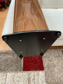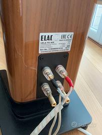 Diffusori da pavimento Elac Vela FS409. Un design complesso: armadi laccati di alta classe e impiallacciati in legno, che hanno una forma trapezoidale e sono angolati all’indietro, combinati con alluminio e vetro.
