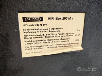 Coppia di diffusori vintage Grundig HiFi-Box 203 Ma, un classico dell'alta fedeltà Made in Germany costruito secondo lo standard DIN 45 500. Le casse sono perfettamente funzionanti e offrono un'ottima resa sonora, con mobili ben conservati, integri e privi di ammaccature o graffi. Per massima trasparenza verso l'acquirente, segnalo che su un diffusore manca il logo frontale Grundig. Inoltre, su una delle due casse il cavo originale è stato tagliato in passato e successivamente ricollegato (quindi non è un pezzo unico dalla cassa allo spinotto), mentre l'altro cavo è integro. Segnalo infine la presenza di lievi tracce di pittura bianca sui cavi, rimasugli di una tinteggiatura in casa del precedente proprietario; si tratta di un dettaglio puramente estetico facilmente rimovibile con un po' di pazienza e che non influisce minimamente sulla qualità del suono. I connettori punto-linea sono presenti su entrambi i diffusori. Caratteristiche tecniche: impedenza 4 Ohm, potenza nominale 15W, potenza musicale 20W. Ideali per appassionati di Hi-Fi vintage e collezionisti del marchio. Disponibile per qualsiasi prova.