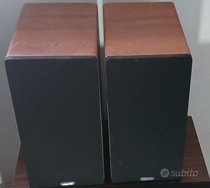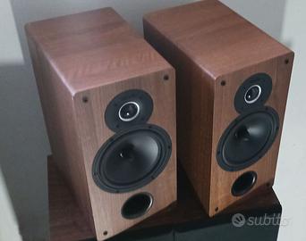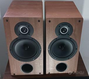 Colore noce, 2 vie, bookshelf, bass reflex, 45-22.000 hz, Sensibilità (2,8 V/1 m), 89 dB, Crossover, 2500 Hz, 4 – 8 ohm, Dimensioni (H x I x P) 362 x 180 x 275 mm, Peso 5,8 kg. A prescindere dai dettagli tecnici pubblicitari come avere woofer in polipropilene rinforzato mica e rifasatore centrale, tweeter in leggerissima seta trattata, magnete al neodimio o camera di risonanza posteriore a ventilazione radiale ecc .. Quello che conta è l'incredibile capacità dinamica, l'ottima estensione alle basse frequenze per diffusori di queste dimensioni e che praticamente vanno stra-bene con qualsiasi amplificatore dai 30 ai 120 watt. Prezzo non tratt.