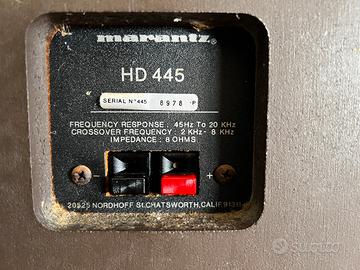 Diffusori vintage (anni ‘70) Marantz HD 445 hi-fi made in U.S.A. da restaurare. Come si puo vedere dalle foto un diffusore è messo diciamo bene, l’altro ha il woofer e il mid-range riparati in modo non professionale quindi le vendo come da riparare/sostituire anche se suonano e funzionano entrambe. Contattare per info. Ritiro a mano a Palermo