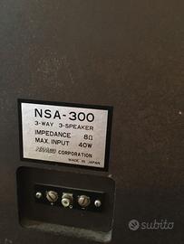 Diffusori NAMCO NSA-300,made in Japan,molto rari. Datati primi anni '80,ottime condizioni,con ancora griglie originali in tela nera,guardare bene le foto. Buone prestazioni.sopratutto con amplificatori dell'epoca. Due possibilità di collegamento. Peso 12 Kg. Dimensioni: H. 50 X L. 30 X P. 20 cm.