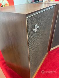 Diffusori 2 vie con tweeter a cupola primi anni 70 in condizioni estetiche incredibilmente buone, ho sostituito il cablaggio originale con una più pratica vaschetta, comunque consegno anche i cavi originali in caso si debbano collegare a un amplificatore con connettori DIN.
