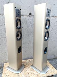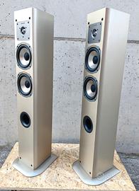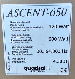 I Quadral Ascent 650 sono diffusori da pavimento che uniscono eleganza tedesca e fedeltà sonora. Ecco i loro punti di forza principali: - Audio Cristallino: Il tweeter a cupola in alluminio garantisce alte frequenze precise e mai affaticanti. - Bassi Potenti: La configurazione a tre vie con doppio woofer offre una spinta dinamica ideale anche per stanze ampie. - Design Raffinato: Il cabinet slanciato con finiture di pregio si integra perfettamente in ogni arredamento moderno. - Versatilità: Eccellenti sia per l'ascolto stereofonico puro che come canali frontali in un sistema Home Cinema. Specifiche Tecniche Tipo: Bass reflex a 3 vie Potenza (Nominale/Musicale): 100 / 150 W Risposta in frequenza: 28 Hz – 46.000 Hz Efficienza (90dB): 89 dB (1W/1m) Impedenza: 4 – 8 Ohm Componenti e Dimensioni Tweeter: RiCOM-V Midrange: 135 mm Ø Titanium-PP Woofer: 170 mm Ø Titanium-PP Frequenze di Crossover: 600 / 2.700 Hz Dimensioni (AxLxP): 93,8 x 19,8 x 26,2 cm Peso: 13,8 kg circa per diffusore Preferibile ritiro a mano con possibilità di ascolto prima dell'acquisto.