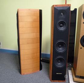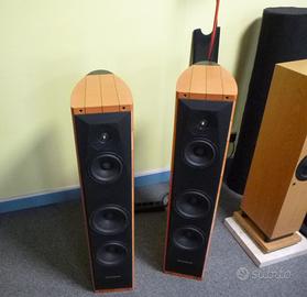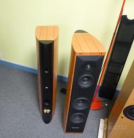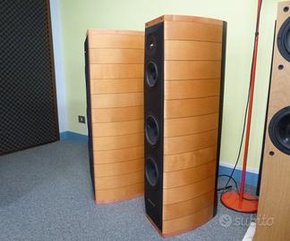 Made in Italy, 3 vie, potenza 50-300 W, 2 woofer 18 cm, 1 medio 15 cm, tweeter ring radiator 2,9 cm, bass-reflex, 90 dB, 4 ohm, risposta in frequenza 32-40.000 Hz, mobile in 32 parti in legno di acero massello e laminato, laccato a più mani con vernice ecologica, cabinet a forma di liuto, rete filtro a ottimizzazione di fase, drivers ultima generazione Scuola Danese ad alta risoluzione e totale controllo del break-up, dimensioni 22,5x109x46, peso 34 kg. Perfettissime, senza alcun segno, come nuove, con imballi originali. Costavano € 7000,00. Conto vendita di un cliente presso di noi: NEGRI HI-FI a Viadana (MN) - telefono 0375-781321.