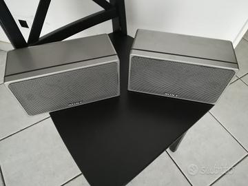 Diffusori Sony SS-X2A. Made in Japan. Peso kg 1.8 ciascuna. Dimensioni 25x12 h. 14. Ferme da un po' ma tenute sempre in casa, non garage o cantine. Purtroppo non riesco più a trovare i supporti da parete. Piccole, belle, e vintage. No spedizione