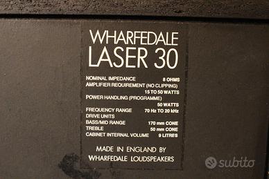 Coppia di diffusori Wharfedale LASER 30, made in England (storica ditta di produzione di diffusori acustici nata nel 1932 - ing. Gilbert Briggs), in condizioni pari al nuovo, componenti tutti originali, crossover compresi.