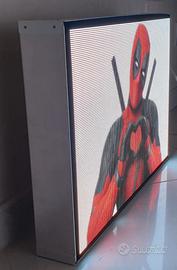 Display LED wall, schermo pubblicitario a colori, P3, WiFi, asincrono, ottimo da installare all'esterno oppure in vetrina rivolto verso l'esterno, alta luminosità, visibile anche di giorno esposto alla luce solare, possibilità di impostazione timer per accensione e spegnimento programmati, dimensioni display 576x384mm, pixels 192x128, dimensioni totali 607x415x85mm, peso totale 7,8Kg, visualizza in ottima qualità video, foto, immagini, GIF animate e testo statico e animato, struttura interamente in alluminio, alimentazione 220/240VAC, fornito di cavo 1,3m, si può fissare a parete, poggiare sul pavimento oppure su un supporto, facile installazione, facile programmazione da PC con software gratuito HDPlayer oppure da smartphone con App gratuita LedArt, non necessario il collegamento fisso al PC, disponibile per informazioni pre e post vendita, ricambi, assistenza hardware e software.