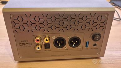 L'HiBy CR08 è un dispositivo bridge di output desktop utilizzato per il trasferimento del segnale con apparecchiature di riproduzione. I metodi di bridging audio in uscita includono: Da 3,5 mm a uscita RCA: (il DAP viene collegato tramite l'uscita da 3,5 mm all'ingresso da 3,5 mm del CR08; gli altri dispositivi vengono collegati all'uscita RCA del CR08). Da 4,4 mm a uscita XLR: (il DAP viene collegato tramite l'uscita da 4,4 mm all'ingresso da 4,4 mm del CR08; gli altri dispositivi vengono collegati all'uscita XLR del CR08). Da segnale SPDIF USB Type-C a coassiale e fibra ottica: (il DAP viene collegato tramite Type-C al CR08; gli altri dispositivi vengono collegati alla porta coassiale o ottica del CR08). Segnale audio USB via USB Type-C: (il DAP viene collegato tramite Type-C al CR08; gli altri dispositivi vengono collegati alla porta USB-A del CR08). Lettura di unità USB e hard disk: (il DAP viene collegato tramite Type-C al CR08; i supporti di memoria vengono collegati alla porta USB-A del CR08). Il dispositivo è dotato di un sistema di raffreddamento attivo (raffreddamento a semiconduttori + ventola), che entra in funzione quando il carico dell'apparecchiatura è elevato e la temperatura aumenta. È quindi ideale per l'utilizzo di lettori che generano molto calore durante la riproduzione e la ricarica, eliminando ogni preoccupazione legata al surriscaldamento. Sul lato è presente uno scomparto per riporre i cavi quando non vengono utilizzati. Nella parte inferiore sono presenti luci d'atmosfera e indicatori del logo. La base è progettata principalmente per il bridging del segnale: effettua solo la conversione dell'interfaccia, senza alcuna conversione del segnale o variazione di livello, dipendendo interamente dal segnale in ingresso.