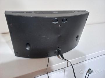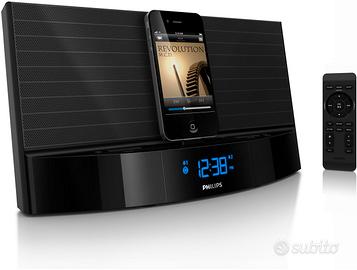 docking station con radio e 20 canali memorizzabili, stereo a due vie da 5w, doppio allarme sveglia, telecomando per navigare ed ascoltare musica dal tuo iPod/iPhone, dimensioni larghezza cm.29, prof. cm.11, altezza cm.16