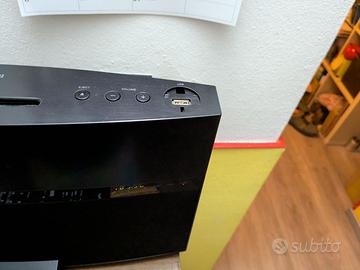 Funzione radio, lettore CD, lettore DVD, ingresso linea per smartphone o ricevitore blue tooth, uscita HDMI per TV ,ingresso per USB , completo di telecomando originale.