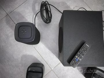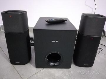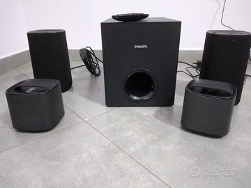 Vendo dolby surround Philips, segni di usura ma ben tenuto e perfettamente funzionante. Casse posteriori e sub woofer wireless. Telecomando riparato da me ma perfettamente funzionante.