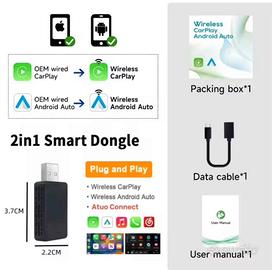 🔌 Dongle CarPlay / Android Auto Wireless – Trasforma il display della tua auto! Aggiorna il sistema della tua auto in pochi secondi 🚀 Con questa chiavetta CarPlay, passi da cavo Wireless . ✅ CarPlay & Android Auto senza cavi ✅ Installazione Plug & Play ✅ Connessione rapida e stabile ✅ Mantiene tutte le funzioni originali dell’auto ✅ Design compatto e moderno 📱 Navigazione, musica, chiamate e app direttamente sullo schermo! 📦 Disponibile subito 📩 Scrivici in privato per info 🚗 Auto compatibili ⚠️ Compatibile solo con auto che hanno CarPlay / Android Auto di serie ✔️ Marche supportate: Audi (A3, A4, A5, A6, Q2, Q3, Q5 – dal 2016) BMW (Serie 1, 2, 3, 4, 5, X1, X3, X5 – dal 2017) Mercedes-Benz (Classe A, B, C, E, GLA, GLC – dal 2016) Volkswagen (Golf 7/8, Passat, Tiguan, Polo, T-Roc – dal 2016) Ford (Focus, Fiesta, Kuga, Puma – SYNC 3) Toyota (Corolla, C-HR, RAV4 – dal 2019) Peugeot (208, 2008, 308, 3008, 5008) Renault (Clio 5, Captur, Megane) Hyundai (i20, i30, Tucson, Kona) Kia (Rio, Ceed, Sportage) Fiat (500, 500X, Tipo – con CarPlay) Opel (Corsa, Astra, Grandland) Skoda (Octavia, Fabia, Karoq) Seat (Ibiza, Leon, Arona) ❗ Non compatibile con auto senza schermo o senza CarPlay originale