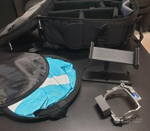 drone, radiocomando, caricabatterie, 2 batterie (31 min circa di autonomia cad), set eliche, connettori vari, protezione telecamera, spare control sticks originali e di ricambio.