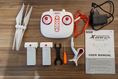 Il drone è perfettamente funzionante. Dotato di 4 eliche nuove, 4 in buone condizioni, due batterie, videocamera HD con microSD da 4 GB e manuale d'istruzioni.
