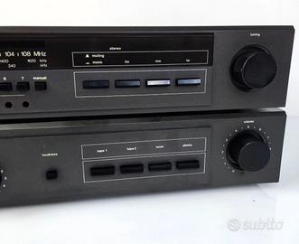 Radio e amplificatore integrato Dual CV-1120 e CT-1120 Il set con amplificatore integrato Dual CV-1120 e radio Dual CT-1120 è un autentico set hi-fi vintage di scuola tedesca, risalente all'epoca in cui Dual puntava su ingegneria, affidabilità e suono neutro e rilassante. Entrambi i dispositivi sono funzionali e in buone condizioni estetiche per la loro età, con frontali puliti ed estetica classica. La radio funziona solo in mono, mentre il coperchio presenta graffi dovuti all'uso, che non ne compromettono la funzionalità. L'amplificatore ha ricevuto nuovi piedini, poiché quelli originali mancavano, e ora è posizionato correttamente e saldamente. Si tratta di un set vintage autentico e completo, ideale per chi cerca il suono Dual, semplicità e carattere senza eccessi. Specifiche tecniche – Dual CV-1120 (amplificatore integrato): Potenza di uscita: 30 W per canale a 8 Ω (stereo) Risposta in frequenza: 15 Hz – 40 kHz Distorsione armonica totale (THD): 0,04% Sensibilità di ingresso: 2 mV (Phono MM), 200 mV (Linea) Rapporto segnale/rumore: 66 dB (MM), 80 dB (Linea) Impedenza degli altoparlanti: 8 Ω – 16 Ω Ideale per impianti hi-fi vintage, collezionisti Dual o utenti alla ricerca di un autentico sistema europeo con un suono adeguato ed equilibrato e una chiara identità tecnica. Dimensioni: 440 x 77 x 250 mm (LxAxP) Connessioni Numero di ingressi: Phono 2 mV/47 kOhm Sintonizzatore 200 mV/470 kOhm 2x Nastro 200 mV/470 kOhm Numero di uscite: Cuffie (anteriore) 2 altoparlanti (8 Ohm ciascuno) Dati tecnici Potenza continua (a fattore di distorsione) 8 Ohm: 2x 30 Watt 4 Ohm: Potenza dinamica 8 Ohm: 2 x 40 Watt 4 Ohm: Distorsione armonica totale: < 0,04% bei Nennleistung Fattore di smorzamento: >20 Risposta in frequenza: 15 - 40.000 Hz (±1,5 dB) Rapporto segnale/rumore: (potenza nominale/2x 50 mW) Phono Alto livello Separazione dei canali stereo: 50 dB Controllo del tono: Bassi: ± dB a Hz (sezionato L + R). Acuti: ± dB a kHz (vedi sopra )
