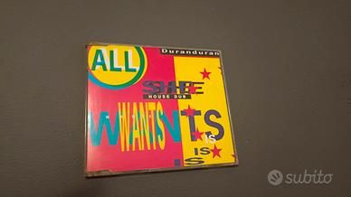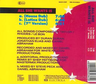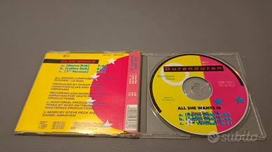 DURAN DURAN All She Wants Is ( Super raro CD singolo remix di 3 tracce del 1988, solo in Germania Ovest, tra cui House Dub Mix [7:08], Latino Dub Mix [6:44] e 7" Mix [4:31], alloggiato in un sottile jewel case con inserto in copertina illustrato. Questa è davvero una fantastica aggiunta all'archivio di qualsiasi serio collezionista di Duran Duran)