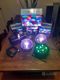 Come si vede dalle foto ... Propongo in vendita kit luci led e macchina del fumo. Lo stock di preciso è composto da : - 1 proiettore luci led multicolore con effetti rotanti - 1 proiettore luci led multicolore con effetti rotanti - 1 faro par led 18 watt con staffa - 1 macchina fumogena 450 watt karma con telecomando di controllo a distanza e staffa Gli oggetti sono perfettamente funzionanti in tutto - funzionano alla perfezione - nessun difetto - sono pari al nuovo - tenuti maniacalmente - tutti completi di scatole ed imballaggi originali. Questi proiettori feste possono essere usati per party pub locali discoteca service live convegni palestra karaoke cerimonie dj hobby ecc... Volendo posso scambiare con casse attive amplificate oppure sub woofer e mixer Scrivetemi per chatt ... poi scambio cellulari