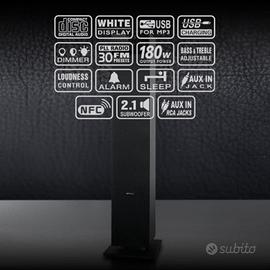 Vendo per non utilizzo Torre Bluetooth A2DP; lettore CD MP3; Potenza in uscita (RMS): 120 W; TUNER PLL FM; Porta USB; Ricarica USB; Presa AUXILIARE x 2; Cassa in legno. Nota: il lettore CD è ottimizzato per i CD originali altrimenti salta. Dimensioni articolo: LxPxA (23 x 25,6 x 100,6 cm).