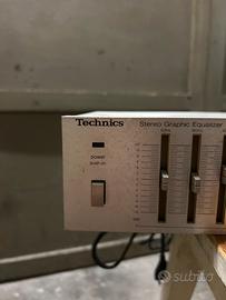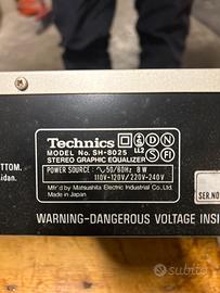 Equalizzatore grafico stereo vintage, Technics SH-8025. È un dispositivo audio che consente di regolare separatamente diverse bande di frequenza per bilanciare il suono o adattarlo all'acustica della stanza. Presenta cursori fisici per alzare o abbassare il volume di specifiche frequenze.