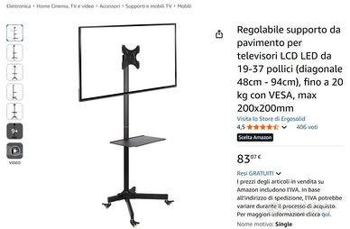• Dotato di 4 ruote girevoli 🔄 • Inclinazione fino a 12° 🛋️ • Design elegante in metallo nero per ogni ambiente 🖤 • Ripiano per dispositivi audio-video o console incluso 🎵 • Altezza regolabile 📏 • Ottime condizioni, lievissimi segni d'usura in foto, prezzo Amazon 83€💲 • Dimensioni: 9 x 33,5 x 77 cm • Modello: Falco-22 • Peso: 10 kg • Compatibilità: TV 19"-37" (diagonale 48cm - 94cm) • Tolleranza: max. 20 kg • VESA: max 200x200mm ATTENZIONE: il prodotto viene spedito smontato. Montaggio facile con set viteria e istruzioni incluse (chiavi esagonali non incluse) 🛠️. NON SI ACCETTANO RESTITUZIONI Per altre info contattatemi