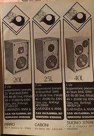 Vendo coppia di casse ( progetto Giussani) ESB MODELLO 25L casse da scaffale due vie potenza 25W Misure 480x295x235mm Peso 10.5Kg woofer 20 cm con sospensione pneumatica in gomma - 1 dome tweeter cm. 2,5 - frequenza di crossover 1.600 Hz - risposta in frequenza: 28 - 20.000 Hz - potenza massima 100 watt - impedenza nominale 8 Ω - sensibiltà 87 db (1mt) - nobile in noce -