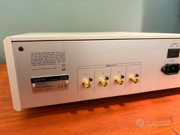 EX DEMO USATO AD UN SOLO EVENTO PARI AL NUOVO CON IMBALLO FATTURABILE G-05 Il Master Sound Discrete Clock, un modulo di clock OCXO* completamente sviluppato internamente, è stato progettato per consentire all'apparecchiatura sorgente digitale combinata di portare l'espressione musicale a un livello superiore. Il G-05 Master Clock Generator è ora disponibile con questo modulo sviluppato internamente, che farà emergere il pieno potenziale di riproduzione musicale delle serie Esoteric K e N, nonché di un'ampia gamma di altri lettori digitali. * OCXO = oscillatore al cristallo controllato dal forno Caratteristiche principali "Master Sound Discrete Clock", che può rendere più musicale la qualità del suono del lettore digitale collegato. Il G-05 può essere utilizzato con le serie Esoteric K, N e vari altri lettori digitali dotati di un ingresso di clock da 10 MHz. L'Esoteric SXT-03, un grande oscillatore al cristallo personalizzato con caratteristiche elettrofisiche ideali. Master Sound TC, un esclusivo sistema di controllo totale della temperatura. Controllo del riscaldatore multistadio con 128 passaggi per mantenere una temperatura del forno uniforme. Tre alimentatori indipendenti che forniscono direttamente la tensione ottimale a ciascun blocco di circuito per un suono di alta qualità. Circuito buffer Esoteric-HCLD in grado di emettere un'onda sinusoidale pura da 10 MHz con la sua potente capacità di trasferimento di corrente. Quattro terminali di uscita dell'orologio a onda sinusoidale da 10 MHz.