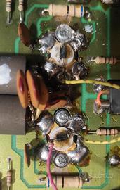 L'amplificatore eroga la potenza consentita dai due transistor finali che dovrebbero essere (la sigla non risulta leggibile per la modalità di costruzione, vedi foto) due Motorola MRF455.