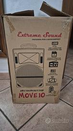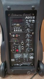 Vendo cassa audio portatile Extreme Sound Move 10 con woofer da 10" (70W RMS / 700W PMPO), batteria interna ricaricabile (sostituita 2 anni fa, ottima autonomia), luci LED integrate e funzione trolley con ruote e manico estraibile.