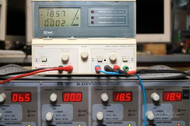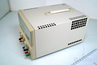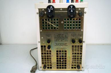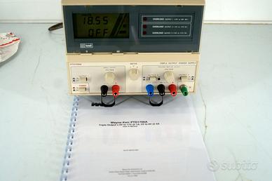 FARNELL WAYNE KERR PTD 1706A TRIPLO ALIMENTATORE DI ALTA QUALITA’ Doppia uscita con tracking da -5 a -17 V e da +5 a +17 Volt 0..1 AUscita positiva da 3 a 6 volt da 0 a 4 Ampere Potenza nominale VA: 300 VA La funzione Tracking permette di variare le due tensioni positiva e negativa con un solo potenziometro. Le uscite sono indipendenti e posso essere messe in serie Tutte le uscite sono dotate di un interruttore ON/OFF. Con l'interruttore in posizione OFF, il voltmetro visualizza l'impostazione di tensione presunta. Il display degli Ampere indica "OFF". In posizione ON, il display della tensione mostra i Volt ai terminali e il display degli Ampere mostra la corrente e che scorre attraverso il carico in prova. Usa Potenziometri a dieci giri pe le sezioni da 5 a 17 V. e normale per sezione da 3 a 6 V. Meno dello 0,05% +2 mV per una variazione della tensione di linea del 10% rispetto al valore nominale. Uscita 6 V - Meno dello 0,2% di uscita + 5 mV per una variazione da 0 a pieno carico. Uscita 17 V - Meno dello 0,05% di uscita + 2 mV per una variazione da 0 a pieno carico. Meno di 2 mV picco-picco a pieno carico. Tipicamente 0,02% per °C. Tipicamente 300 µs per stabilizzarsi entro 50 mV per una variazione del carico del 10-100%. iii) Fusibili di uscita CC (accessibili dalla parte inferiore del telaio). iv) Protezione da tensione inversa tramite diodo parallelo. v) Protezione da sovratensione sull'uscita a 6 V tramite SCR a leva. vi) Protezione da sovraccarico continuo sull'uscita a 6 V tramite sganciatore termico. i) Limite di corrente di foldback sull'uscita a 6 V. ii) Limite di corrente sull'uscita bipolare a 17 V. LCD personalizzato, illuminato, gestito da microprocessore e commutabile tra le uscite, che mostra contemporaneamente volt e ampere in cifre alte 10 mm con grafico a barre analogico, selezionabile dall'utente per indicare Volt,Ampere o Potenza. perfetto, sembra nuovo, la costruzione, Inglese di alta qualità, perfetto nel funzionamento