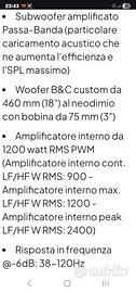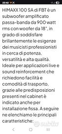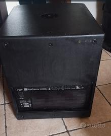 Subwoofer che non ha bisogno di presentazioni in buon stato generale,presenta qualche graffietto ma nulla che pregiidichi il perfetto funzionamento,preferisco venderlo senza spedizioni visto che pesa ben 43 kg e non vorrei si danneggiasse durante il trasporto,qualsiasi prova. Non esitate a contattare senza però perdite di tempo,grazie . Amplificatore interno da 1200 watt RMS PWM (Amplificatore interno cont. LF/HF W RMS: 900 - Amplificatore interno max. LF/HF W RMS: 1200 - Amplificatore interno peak LF/HF W RMS: 2400) Risposta in frequenza @-6dB: 38-120Hz Sensibilità (@1W/1m): 102 dB SPL massimo cont./peak: 135/139 dB Dispersione H x V: omnidirezionale Box in multistrato di betulla da 18 mm, con 8 punti di ancoraggio M10, supporto per stativo e 2 maniglie integrate in legno Predisposto per montaggio di 4 ruote opzionali ø 80 mm Dimesioni (cm): 53 x 60,5 x 65,5 Peso netto (kg): 43