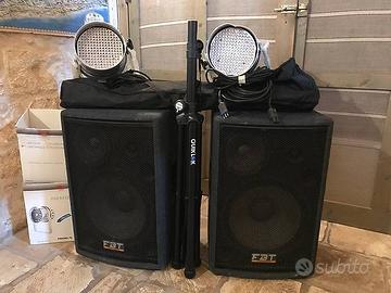 Casse attive FBT Lightforce LF 50A Le casse sono in legno, a tre vie e con un woofer da 15' potenza di uscita 350w rms per cassa singola, perfettamente funzionanti ma con normali segni di usura il rivestimento tipo moquette è intatto niente strappi o buchi .