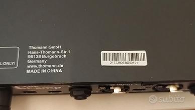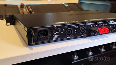 Amplificatore di potenza The t.amp S-100 MK II di Thomann SENZA VENTOLA USATO PER UN SOLO MESE! Vendo per fine lavorazione • 2 x 100 W su 4 ohm • 2 x 65 W su 8 ohm • Ingressi bilanciati con XLR e jack • Possibilità di funzionamento in modalità bridge • Uscite power twist e a morsetto •Tutti i circuiti di protezione, incluso "Avvio graduale" • Livello d'ingresso commutabile da -0 a +4 db • Fattore di damping > 150 • Senza ventola •Sensibilità d'ingresso commutabile da 0,775 V (RMS) a 1,4 Vrms, o commutabile a 26 dB di guadagno • 1 U, profondità 33 cm • Tasso di slew 35 V/us • Peso: 7,5 kg
