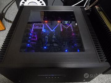 Finale High-End Made in Germany, 250 W RMS 8 ohm, 350 W RMS 4 ohm, 24 transistor MOSFET per canale per più di 60 Ampere, doppio trasformatore toroidale (2x1000 VA), doppia alimentazione separata, componentistica selezionata, ingressi XLR e RCA, istruzioni e imballo originali, dimensioni 430x430x253, peso 42 kg, perfetto, come nuovo.