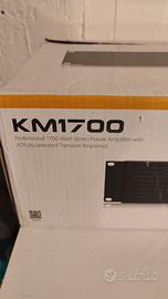 Lo straordinario KM1700 racchiude una potenza in uscita di 1700 Watt in un formato leggero di soli 12,5kg, grazie alla tecnologia Behringer Transient Response Accelerated (ATR). L'abbondanza di potenza (1700 Watt in modalità Bridge, 2x 800 Watt @ 4 Ohm, 2x 500 Watt @ 8 Ohm) e l'efficienza hi-tech si combinano, creando un cavallo da tiro che manterrà il tuo rig in attività per anni e anni a venire. Caratteristiche principali •Potenza di 2x 800 Watt su 4 Ohm, 2x 500 Watt su 8 Ohm, 1700 watt su 8 Ohm (modalità bridge) •Tecnologia ATR (Accelerated Transient Response) per un punch ed una nitidezza definitivi •Limiter selezionabili per offrire il massimo livello di uscita ed una protezione da sovraccarico affidabile •LED clip e segnale per monitorare le performance •Connettori di ingresso XLR e TRS 1/4" per la compatibilità con qualsiasi sorgente •Connettori speaker professionali •Alimentazione CC indipendente e protezione da cortocircuito su ogni canale per proteggere automaticamente amplificatore e altoparlanti •Trasformatori toroidali a corrente elevata per una elevatissima risposta ai transienti ed una affidabilità assoluta •Ventilazione "front to back" per un funzionamento affidabile •Costruzione robusta resistente agli urti, chassis 2U montabile a rack interamente in acciaio •Disegnato e progettato in Germania •Dimensioni: 375 x 89 x 482mm •Peso: 12,47kg NB: Prezzo da concordare