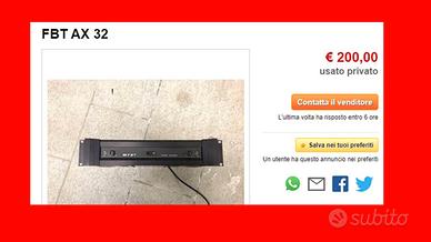 Finale di potenza stereo per strumenti musicali - Marca FBT AX 32. Potenza RMS 150 Watt per canale.Disponibile al ritiro a mano presso la mia abitazione, possibilità spedizione a carico del destinatario.