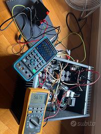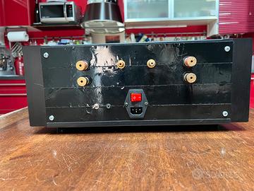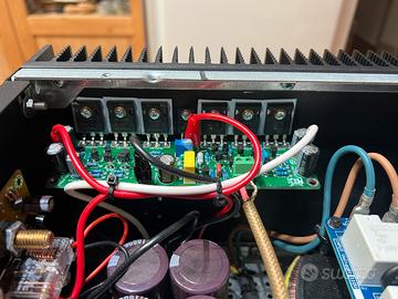 Realizzazione completamente dual mono Soft start Possibilità di selezionare accensione remota tramite trigger 12v o tramite pulsante sul frontale Caratteristiche (per singolo canale) MOSFET utilizzati: IRFP240 20A x3, IRFP9240 12A x3, IRFS910B x1 Potenza: 150W 8 ohm - 300W 4 ohm - 600W 2 ohm Risposta in frequenza: 5Hz - 250kHz a -3dB THD: <0,02% a 150W 8 ohm Rapporto segnale rumore (SNR): >97dB Gain: 31dB Trasformatore: toroidale 500VA Condensatori di alimentazione: 6x10000µF 80V Protezione altoparlanti Peso totale 22KG