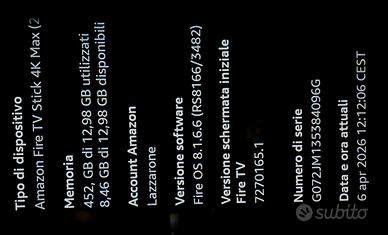 Dispositivo de streaming Fire TV Stick 4K Max. Fire TV Stick 4K Max, Streaming 4K potente, 4K Ultra HD, Telecomando vocale Alexa, Wi-Fi 6E, 16 GB di memoria. Nuova, acquistata il 14 marzo 2026. Si prega di astenersi da sconti vari o scambio.
