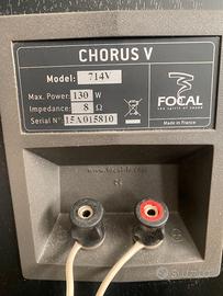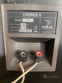 Vendo coppia di diffusori Focal Chorus 714V, suono Hi-Fi di livello, ideali per impianti stereo e home audio. ✔ Diffusori da pavimento 2.5 vie bass reflex ✔ Suono dettagliato e dinamico (tipico Focal) ✔ Ottima sensibilità (91 dB) → facili da pilotare Perfettamente funzionanti Tenuti con cura Nessun difetto strutturale Utilizzati in ambiente domestico Suono molto equilibrato, con: - bassi presenti ma controllati - medi puliti - alti brillanti (tweeter Focal) Ideali per: - musica (rock, elettronica, jazz) - ascolto Hi-Fi in salotto 📐 Specifiche principali Risposta in frequenza: 52 Hz – 28 kHz Impedenza: 8 ohm Potenza: 90W RMS Peso: 16 kg cadauna