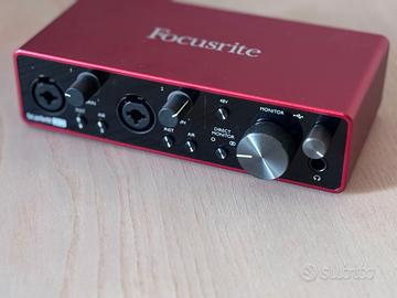 Vendo Focusrite Scarlett 2i2 terza generazione interfaccia audio professionale USB C molto usata per home studio, registrazione voce, chitarra, podcast e streaming Completa del box originale Perfettamente funzionante Condizioni: ottime / pari al nuovo Qualità audio: preamplificatori Focusrite molto puliti e professionali Ingressi: 2 combo XLR/Jack con alimentazione phantom 48V Connessione: USB-C (plug & play su Mac e Windows) Ideale per: registrazione, produzione musicale, streaming, podcast simile a volt universal audio apollo audient id14 Possibile consegna. A mano zona lecce brindisi taranto