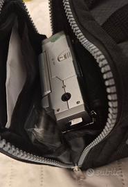 Fotocamera e videocamera digitali portatili in borsa compatta con accessori.