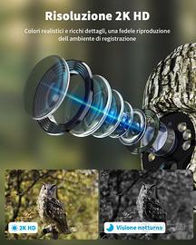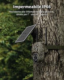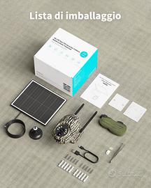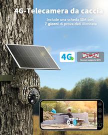 4G LTE Fototrappola con SIM, Fotocamera da Caccia, 2K Telecamera con Pannello Solare Esterna, Visione Notturna a Colori, Rilevamento PIR, IP66, 360° Fotocamera solare 4G LTE: La fotocamera solare per la fauna selvatica include con una scheda SIM (7 giorni di prova dati illimitata, al termine dei quali è possibile acquistare un pacchetto nell'app per 12,90 al mese, e ci sono altre opzioni). Trasmissione in tempo reale e acquisizione di immagini ad alta qualità a distanza, senza bisogno di WiFi. Registrazione continua nel cloud per non perdere nessun momento della vita selvaggia. Versatile e Durevole: (Suggerimento: i pannelli solari funzionano meglio quando sono esposti alla luce diretta del sole.)La nostra telecamera a pannello solare da 6W con batteria integrata da 10400 mAh è un'ottima soluzione per uso esterno ed è caratterizzata dalla sua certificazione IP66 robusta e resistente alle intemperie, che la rende particolarmente adatta per ambienti esigenti come fienili, fattorie, ranch, cantieri edili, cabine, camper e altro ancora. Sorveglianza a tutto tondo a 360°: La telecamera di sorveglianza per fauna selvatica 4G offre una soluzione di sorveglianza completa con il suo obiettivo Ultra HD 2K e vista panoramica a 360°. Con visione notturna a colori, LED IR e angolo di panoramica di 355° e inclinazione di 100°. La telecamera senza fili dispone anche di zoom digitale 4x, funzione riflettore e non richiede WiFi per una copertura completa e registrazioni dettagliate. Controllo remoto e video in diretta: La telecamera 4G LTE supporta il controllo da remoto tramite app UBox. Inserisci la SIM inclusa, montala, scansiona il QR code e accedi in tempo reale dal tuo telefono. Condividi il live streaming con familiari e amici. Supporta archiviazione su scheda di memoria (non inclusa) e cloud (30 giorni gratuito). Servizio di alta qualità: In caso di problemi con l'installazione, l'utilizzo o la connessione, puoi contattarci. Le nostre fotocamere possono utilizzare schede SIM
