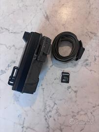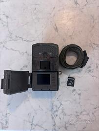 Il corpo è robusto, impermeabile (IP65/IP66) e include un obiettivo centrale, display LCD per configurazione e visualizzazione file, tasti di controllo e uno sportello che protegge vano SD e batterie (4 o 8 AA). La scheda SD da 32 GB salva i file catturati. Il cinturino da 2m consente il montaggio su alberi o pali.