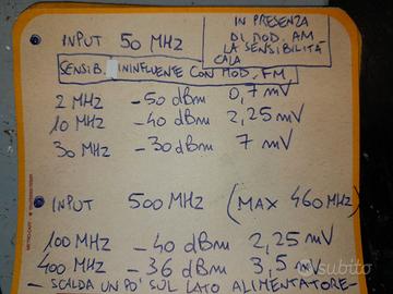 frequenzimetro marca Schwille. misura da 100 KHz fino a 460 MHz. le sensibilita' misurate sono riportate in foto